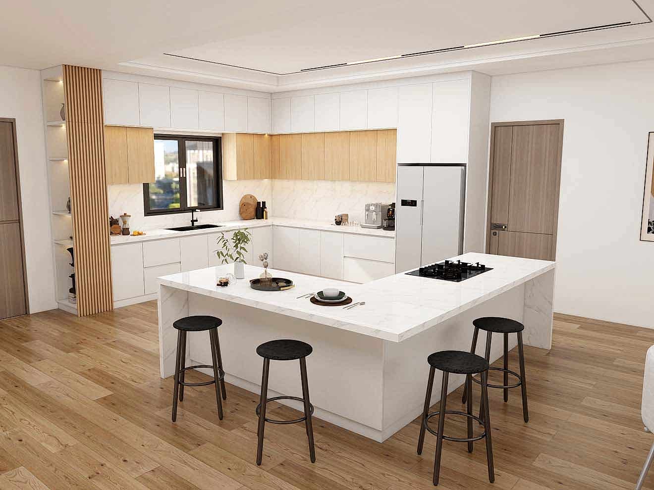 This kitchen embodies a perfect balance between sleek minimalism and natural warmth through its kitchen designs with white cabinets. The inclusion of a natural wood accent softens the overall look, making the space more inviting. The marble island enhances the luxurious feel of the kitchen, making it ideal for both cooking and casual dining. The smooth lines and modern design ensure the kitchen is functional and visually striking.