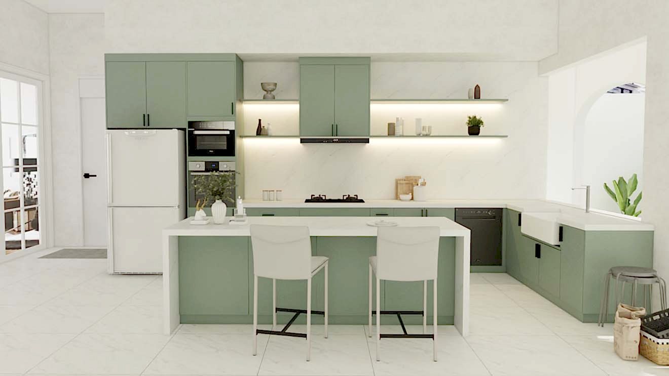 The design concept focuses on creating a serene and inviting kitchen space using sage green kitchen cabinets. The soft green hue is both calming and refreshing, perfect for a modern kitchen that exudes tranquility. The minimalist approach is enhanced by the sleek white countertops and open shelving, which add to the room’s airy and spacious feel. This design is ideal for those who seek a blend of contemporary style and natural elements in their home.