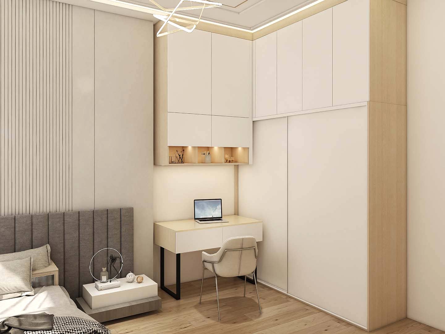 The ‘Minimalist Elegance: White Sliding Door Wardrobe’ merges aesthetic appeal with practical design. The sliding doors offer a space-efficient solution for modern living spaces, while the internal configuration is optimized for easy organization and access, making daily use both simple and enjoyable.