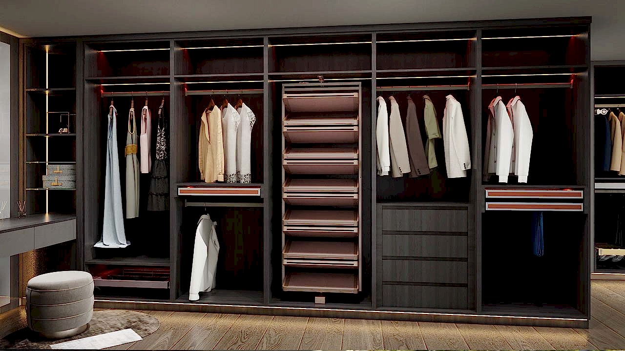 This walk-in closet is designed with the user’s needs in mind. The ergonomic layout allows for easy access to all storage areas without unnecessary reaching or bending. The sliding doors enhance the functionality, making it perfect for tight spaces by eliminating the need for clearance required by traditional doors. This design ensures that every inch of space is utilized effectively, making daily routines more streamlined and less cluttered.