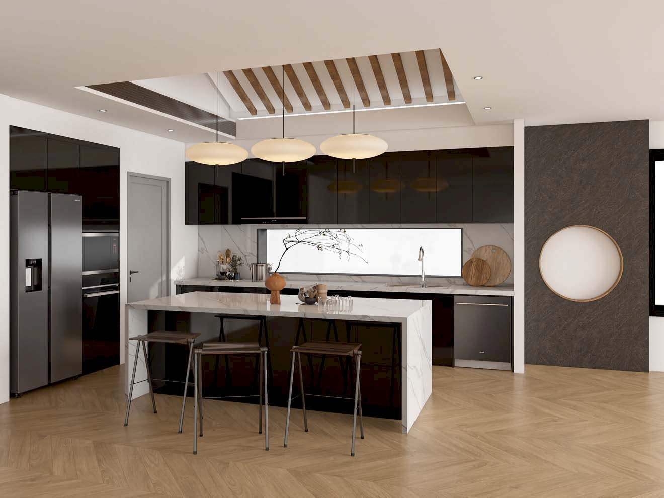 The Lacquer Kitchen Cabinets boast a high-gloss black finish that adds depth and dimension to the space. Paired with light marble countertops and wooden flooring, the cabinets offer a striking contrast that highlights the modern aesthetic of the kitchen.