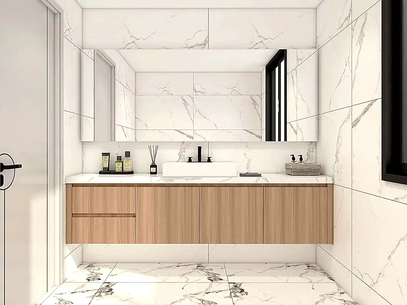 The Modern Gallery Wood Veneer Plywood Bathroom Vanity is designed not only for its visual impact but also for its practicality. The ergonomic layout ensures that all storage areas are easily accessible, enhancing the functionality of the vanity. The smooth surfaces are easy to clean and maintain, contributing to a hygienic and hassle-free bathroom environment.