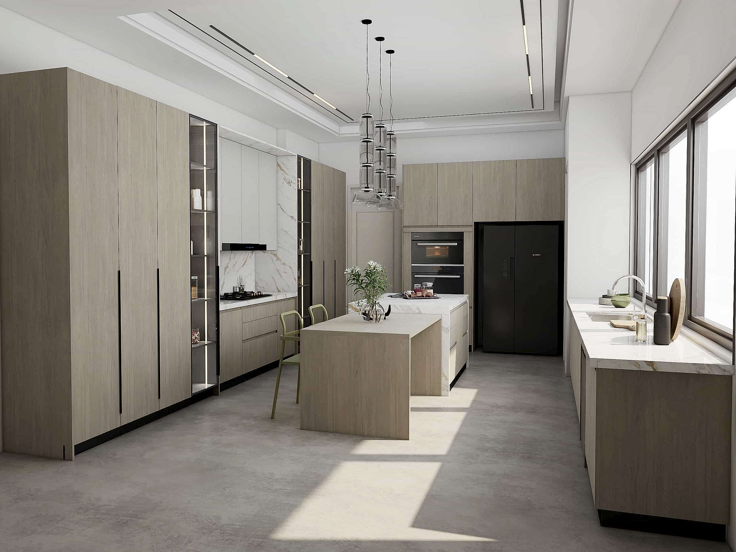 The use of a rare natural veneer underlines the kitchen’s luxury quotient. With years of expertise, this veneer radiates a unique elegance, further elevated by the expansive quartz stone, which beautifully captures and refracts ambient light.