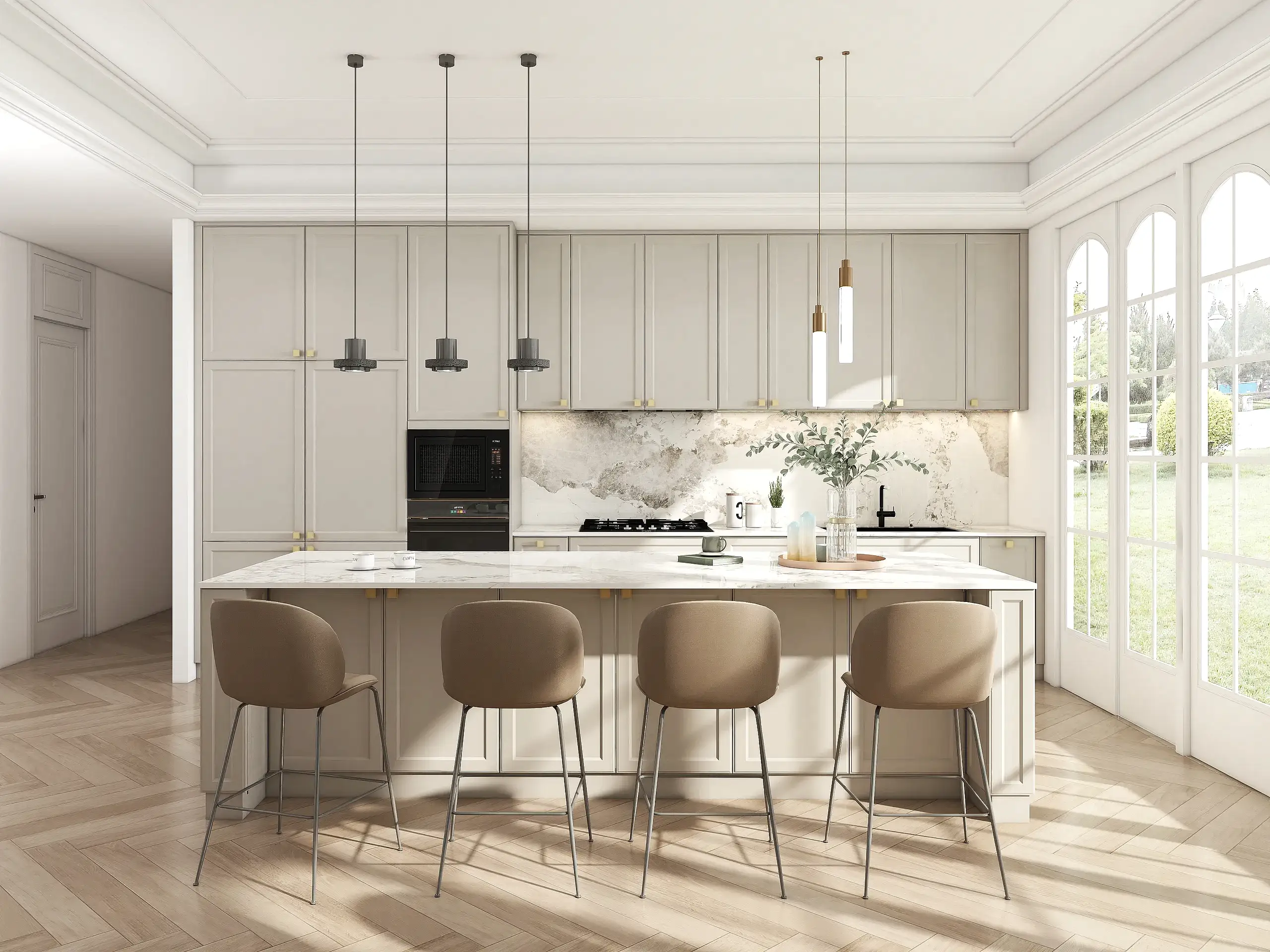 The soft beige color of the slim shaker cabinets pairs beautifully with the neutral lacquer finish, creating a clean, polished look. The reflective lacquer surface enhances brightness and spaciousness, while the marble countertop adds depth and texture, creating a balanced and inviting atmosphere.