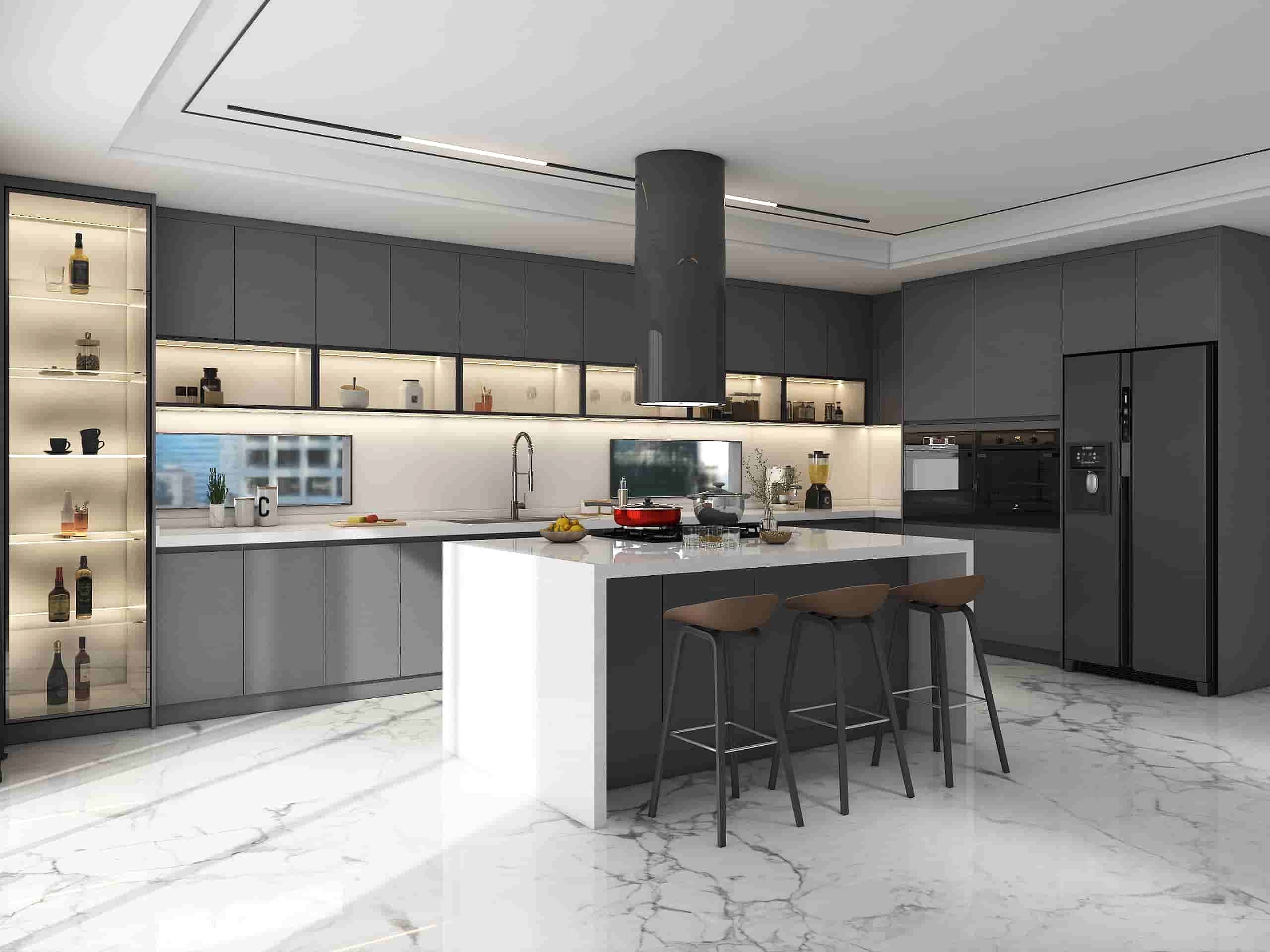 The Modern Grey Kitchen with Smart Storage Solutions exemplifies a sleek and refined approach to contemporary design. The uniform grey melamine finish across the cabinets lends a sophisticated and cohesive look that harmonizes with the modern home aesthetic. Clean lines and handleless fronts contribute to the kitchen’s streamlined and uncluttered feel, reflecting a modern minimalism that is both stylish and practical.