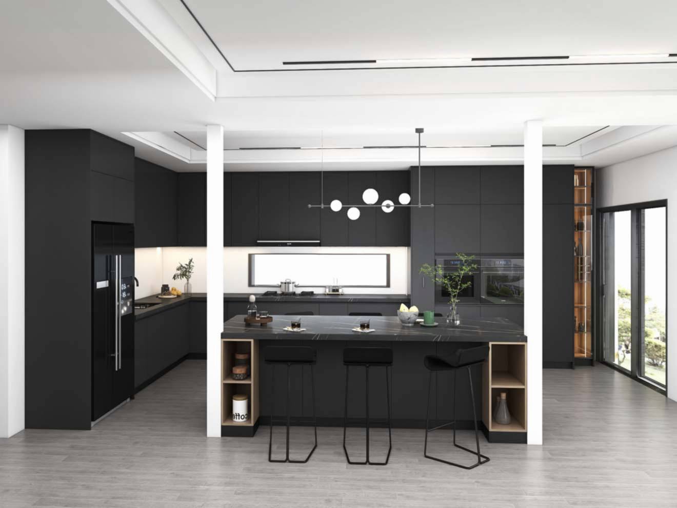 The dark grey kitchen cabinets are finished with a smooth matte surface, giving the kitchen a sleek and polished appearance. The dark tones create a striking contrast against the light flooring and backsplash, while the golden accents provide a warm and luxurious touch. The matte finish not only enhances the visual appeal but also makes the cabinets resistant to fingerprints and easy to maintain, ensuring they look pristine over time.