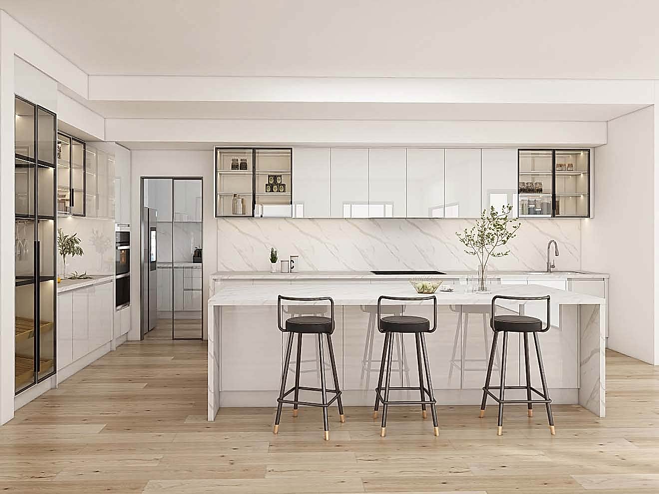 The white kitchen cabinets feature a high-gloss finish that enhances the room’s brightness by reflecting light throughout the space. The marble countertops and backsplash add a touch of luxury, with their subtle veining complementing the crisp white of the cabinets. This combination creates a cohesive and refined look that is both stylish and timeless.