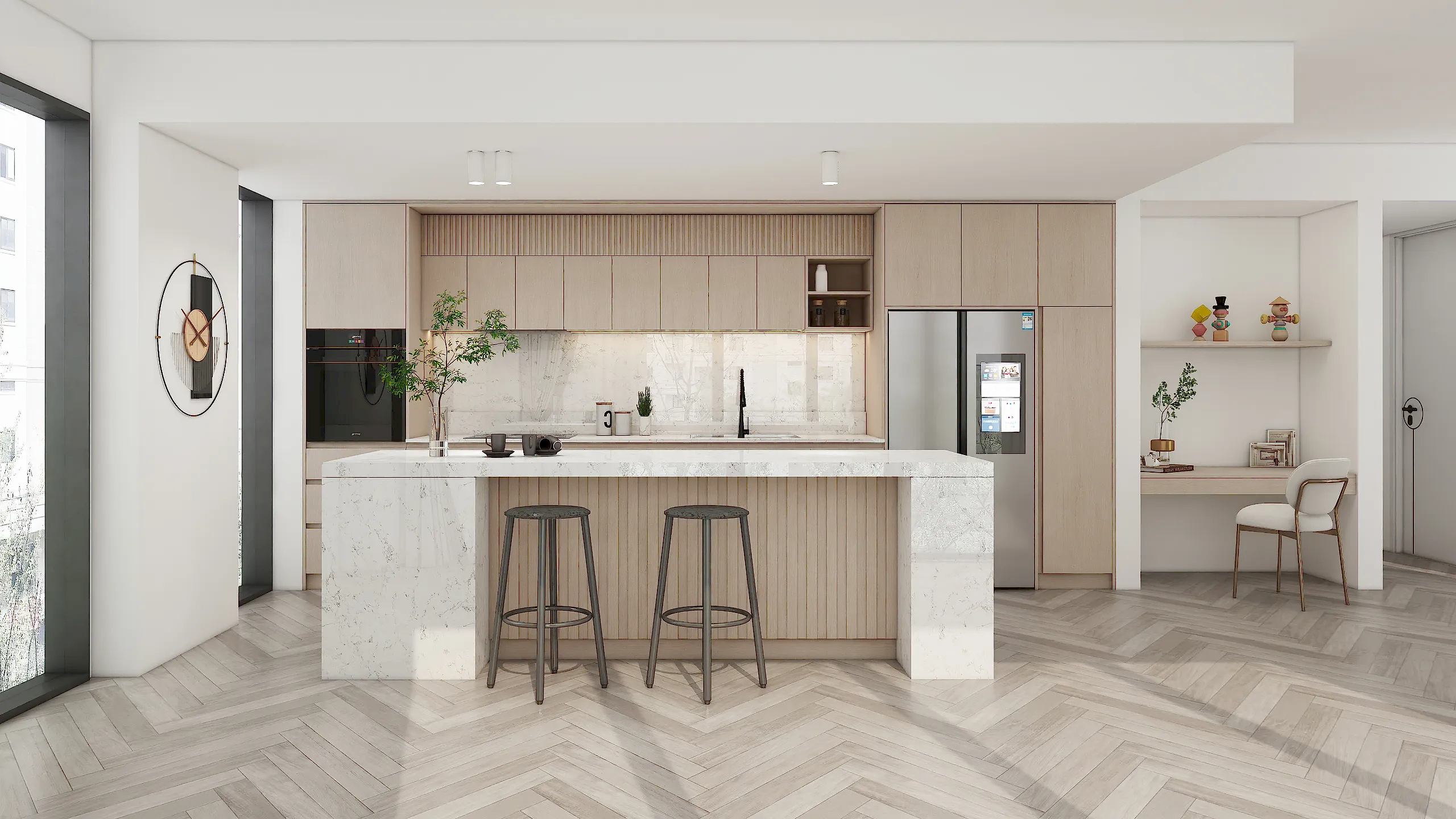 The melamine finish features a light wood grain that pairs beautifully with neutral tones, creating a harmonious and calming environment. The marble island surface adds a touch of luxury, while the handleless cabinets maintain a clean, uninterrupted visual flow. This combination of textures elevates the kitchen’s overall aesthetic.