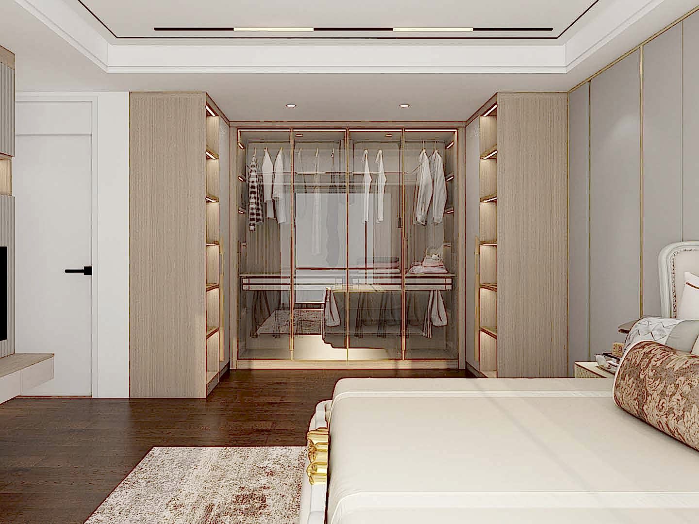 The Wood U-Shaped Sliding Door Wardrobe with Glass Doors is designed with user convenience in mind. The sliding doors provide effortless access without the need for additional space, and the glass panels make it easy to view the contents without opening the doors. This thoughtful design ensures that the wardrobe is not only a storage solution but also a pleasure to use, enhancing the daily routine of selecting outfits and accessing belongings.